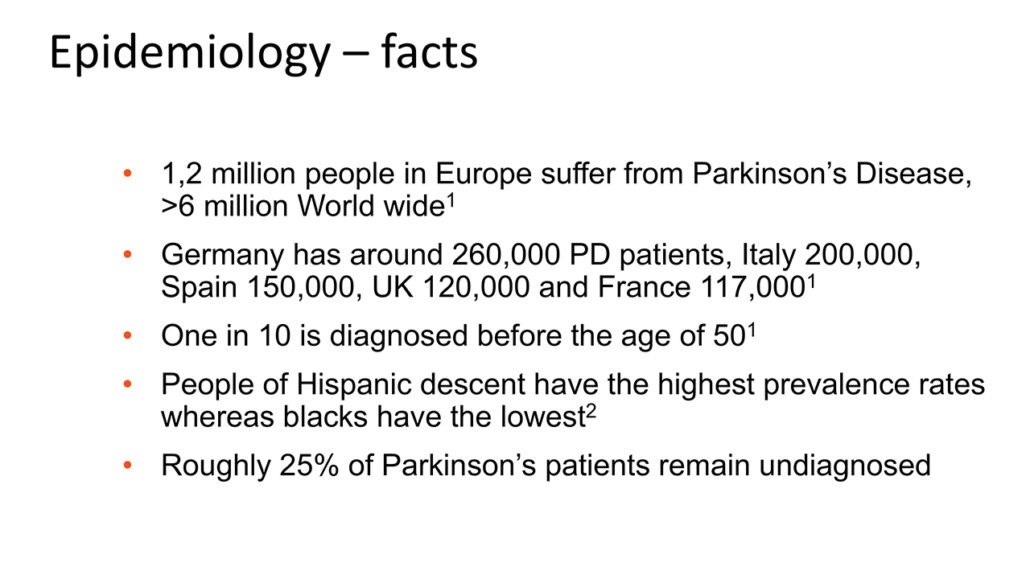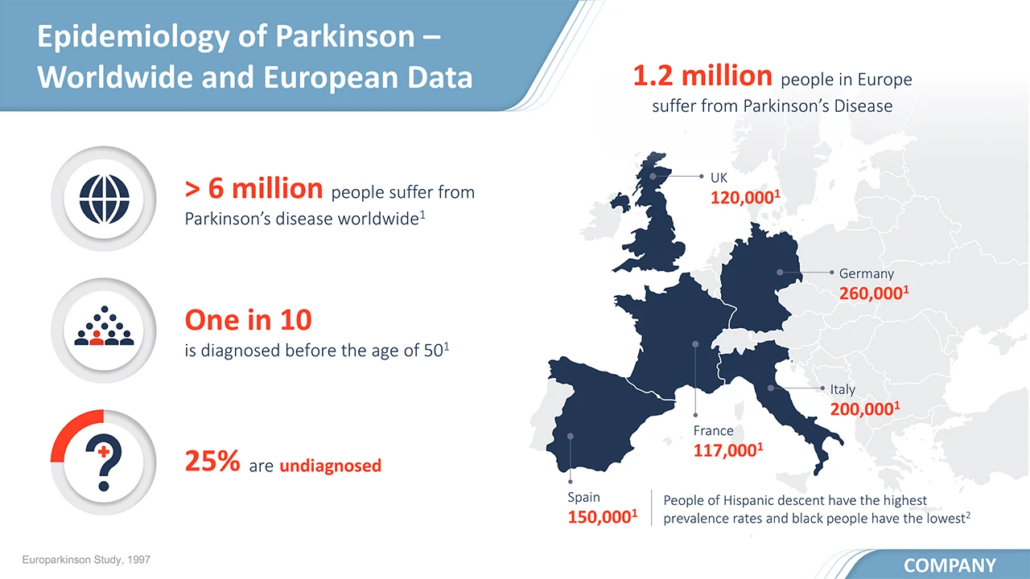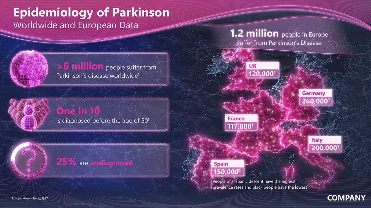 The challenge: A pharmaceutical team started with a basic slide presenting Parkinson’s disease epidemiology as a simple list of bullet points. The slide contained important data—1.2 million Europeans with Parkinson’s, country-specific patient numbers, age demographics, and diagnostic gaps—but the text-heavy format made it difficult for any audience to quickly grasp the scale and significance of the disease burden.