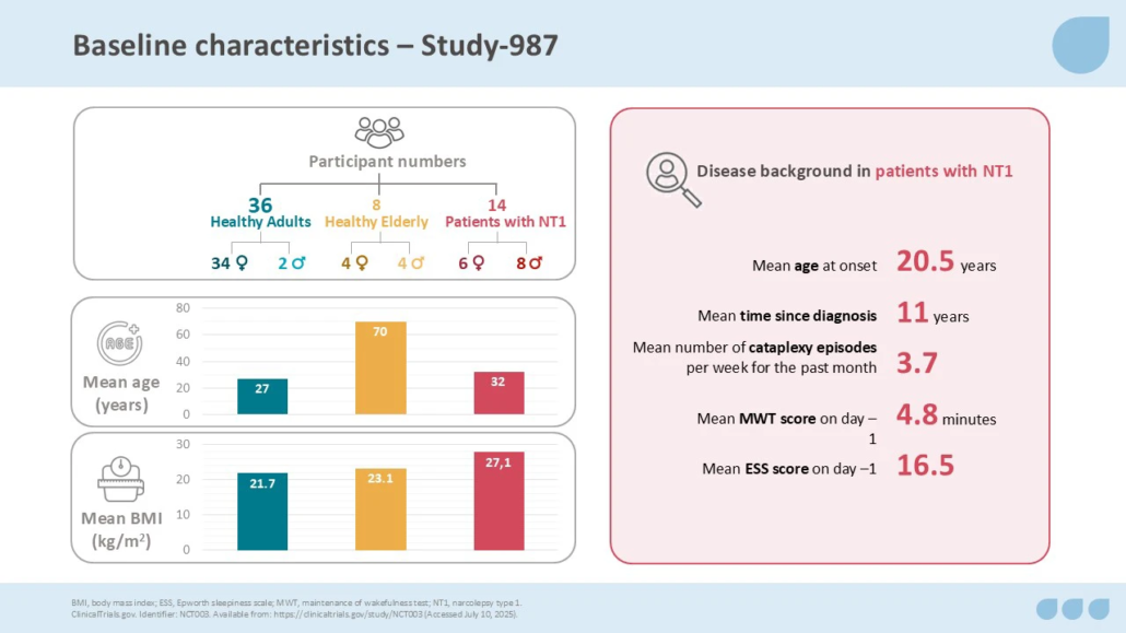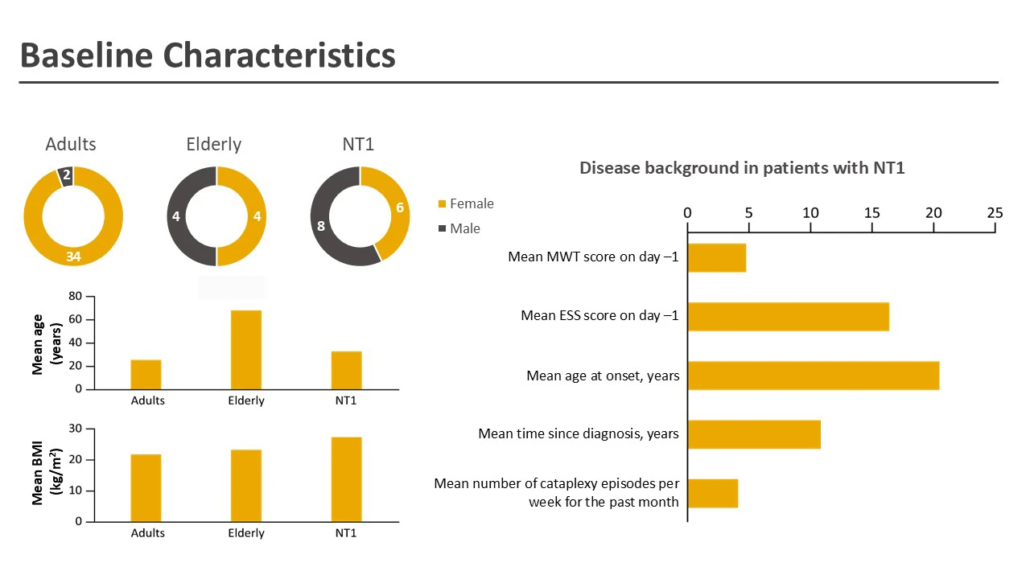 The challenge: A clinical study slide presenting baseline characteristics looked professional at first glance—it contained pie charts, bar graphs, and numerical data. However, closer examination revealed fundamental communication problems that made it difficult for readers to extract meaningful comparisons between participant groups (Adults, Elderly, and NT1 patients).