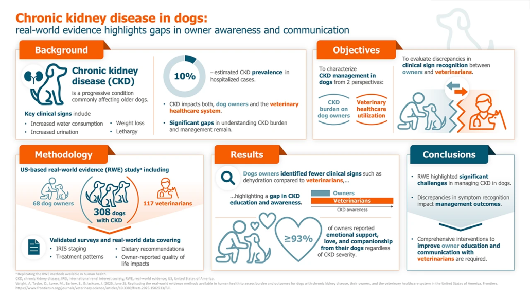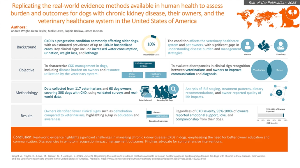 The challenge: A comprehensive veterinary study on chronic kidney disease (CKD) in dogs contained valuable research comparing clinical sign recognition between dog owners and veterinarians. However, the slide presented this important epidemiological data in a dense, text-heavy format with multiple competing visual elements and inconsistent iconography that made it difficult to quickly grasp the key insights.