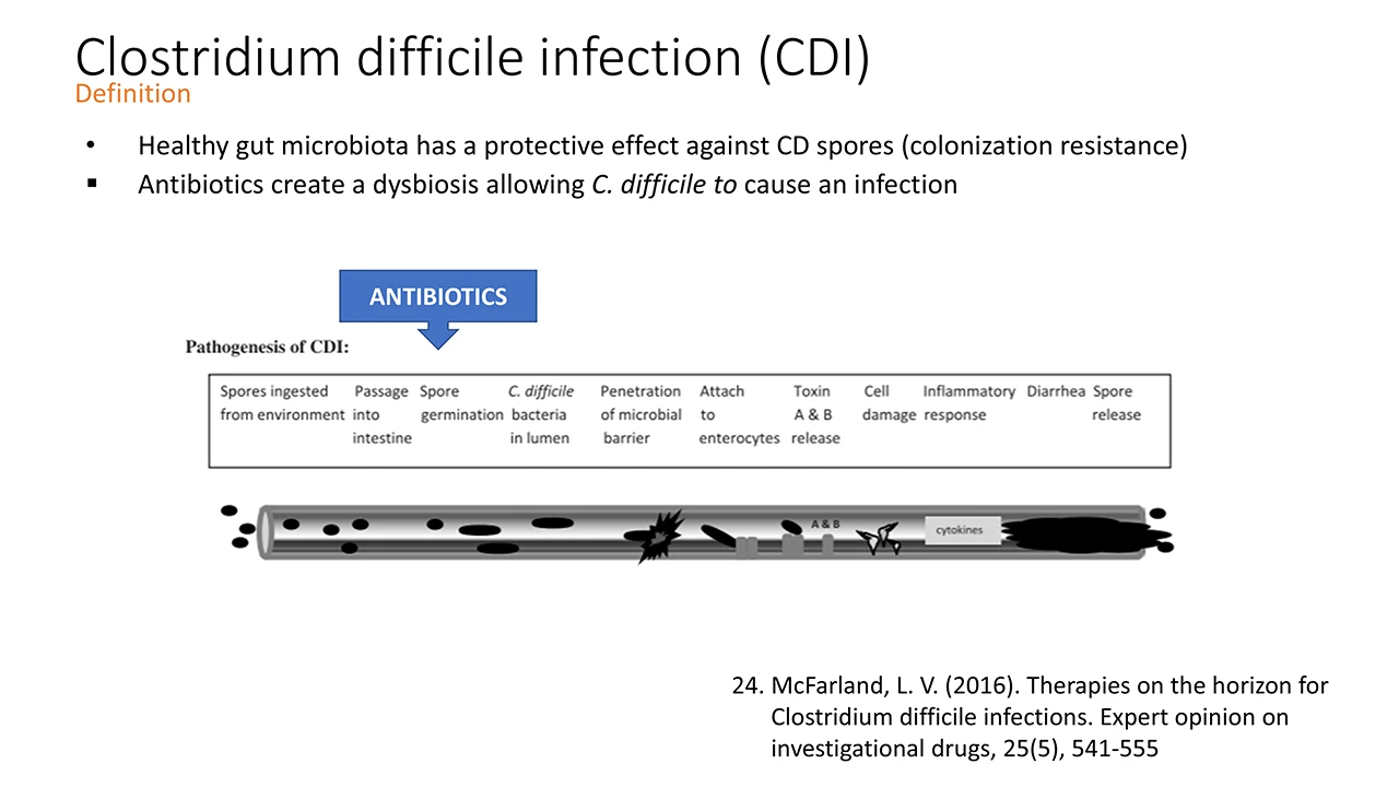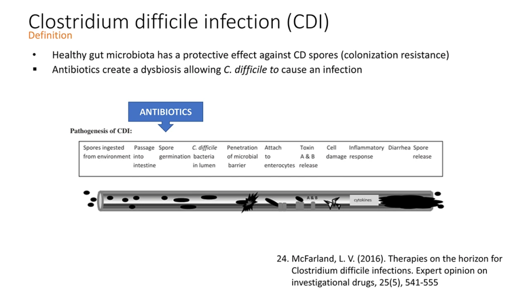 The challenge: A technical slide defining Clostridium difficile infection (CDI) presented the pathogenesis as a linear text-heavy explanation with a basic flow diagram. While medically accurate, it read like a textbook excerpt and failed to help the target audience visualize the actual disease process in anatomical context.