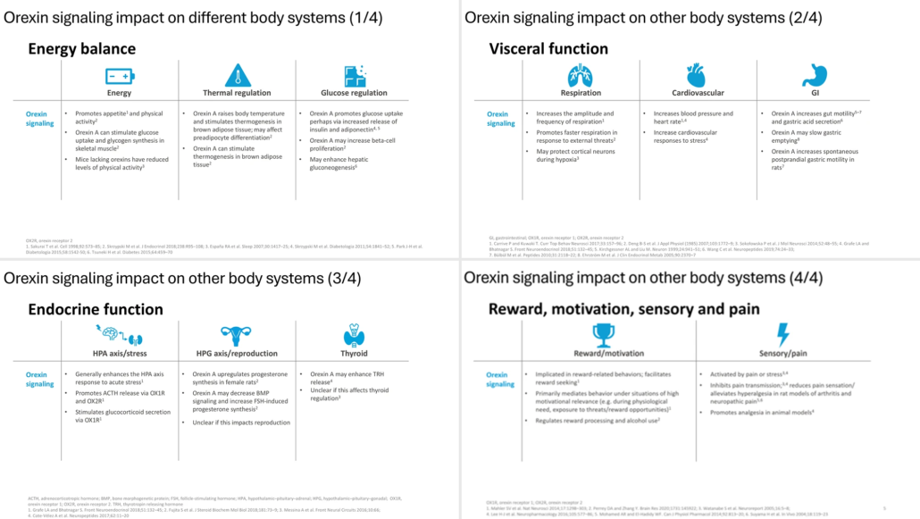 The challenge: A comprehensive overview of orexin signaling’s impact on different body systems was presented across four separate slides, each covering different physiological functions (energy balance, visceral functions, endocrine functions, and neurological/behavioral functions). While each slide was well-designed with clean layouts and appropriate icons, the multi-slide format created several problems: